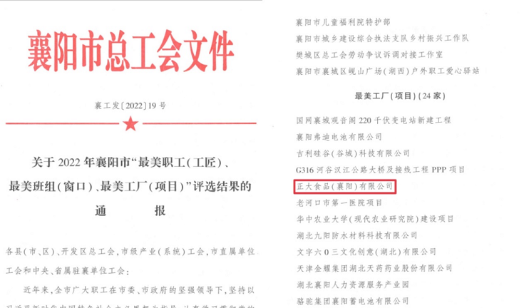 喜報|正大食品(襄陽)有限公司榮獲襄陽市“最美工廠(項目)”獎項